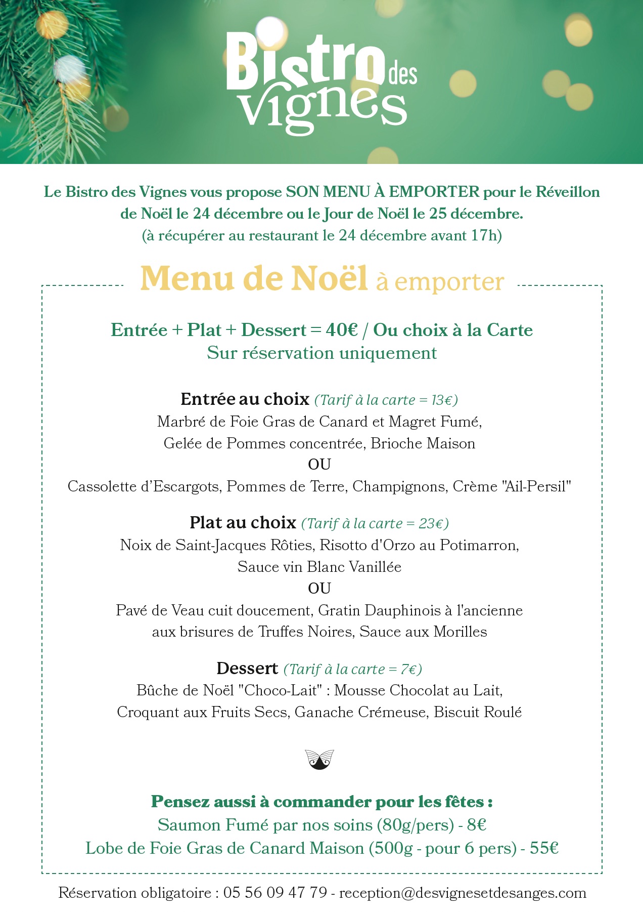Pour le Réveillon du 24 décembre ou le déjeuner du 25 décembre, le Bistro des Vignes vous propose un Menu de Noël à emporter mettant à l’honneur les saveurs festives et les produits d’exception du terroir.