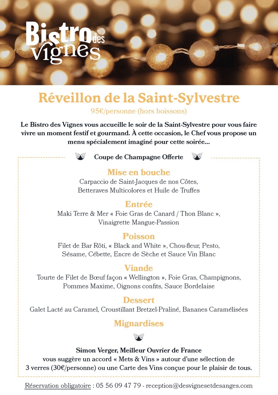 Le 31 décembre, le Bistro des Vignes vous accueille pour une soirée élégante et festive. Le Chef propose un menu raffiné à 95€ par personne (hors boissons), conçu spécialement pour faire de cette dernière soirée de l’année un moment inoubliable.
